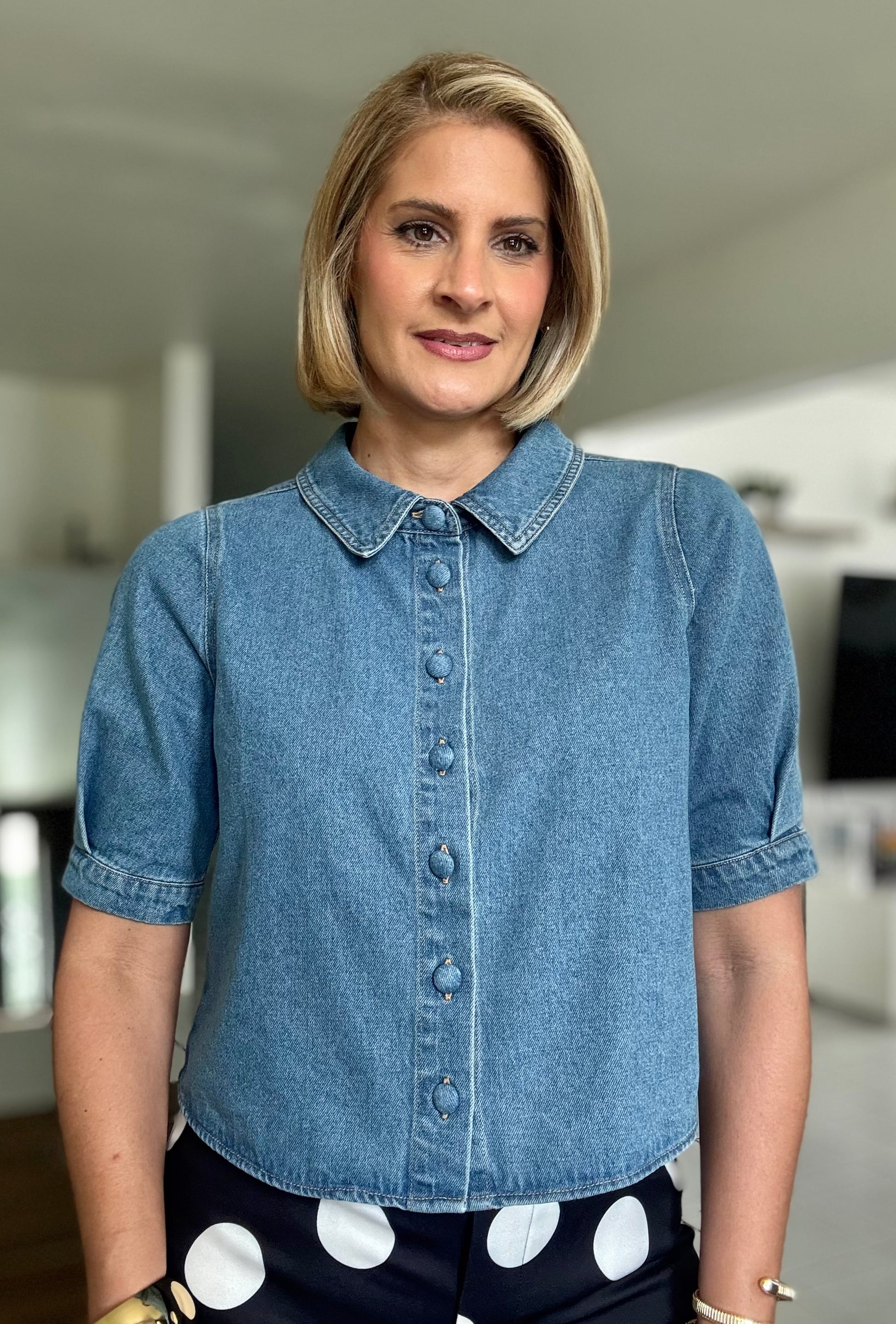 Hermosa blusa en tela algodón y algo de spandex (simulando denim) de botones frontales funcionales, mangas abullonadas con detalle de pliegue y cuello. Los botones están forrados en la misma tela de la blusa, lo cual elevan su estilo para un toque mas casual. Excelente calidad.