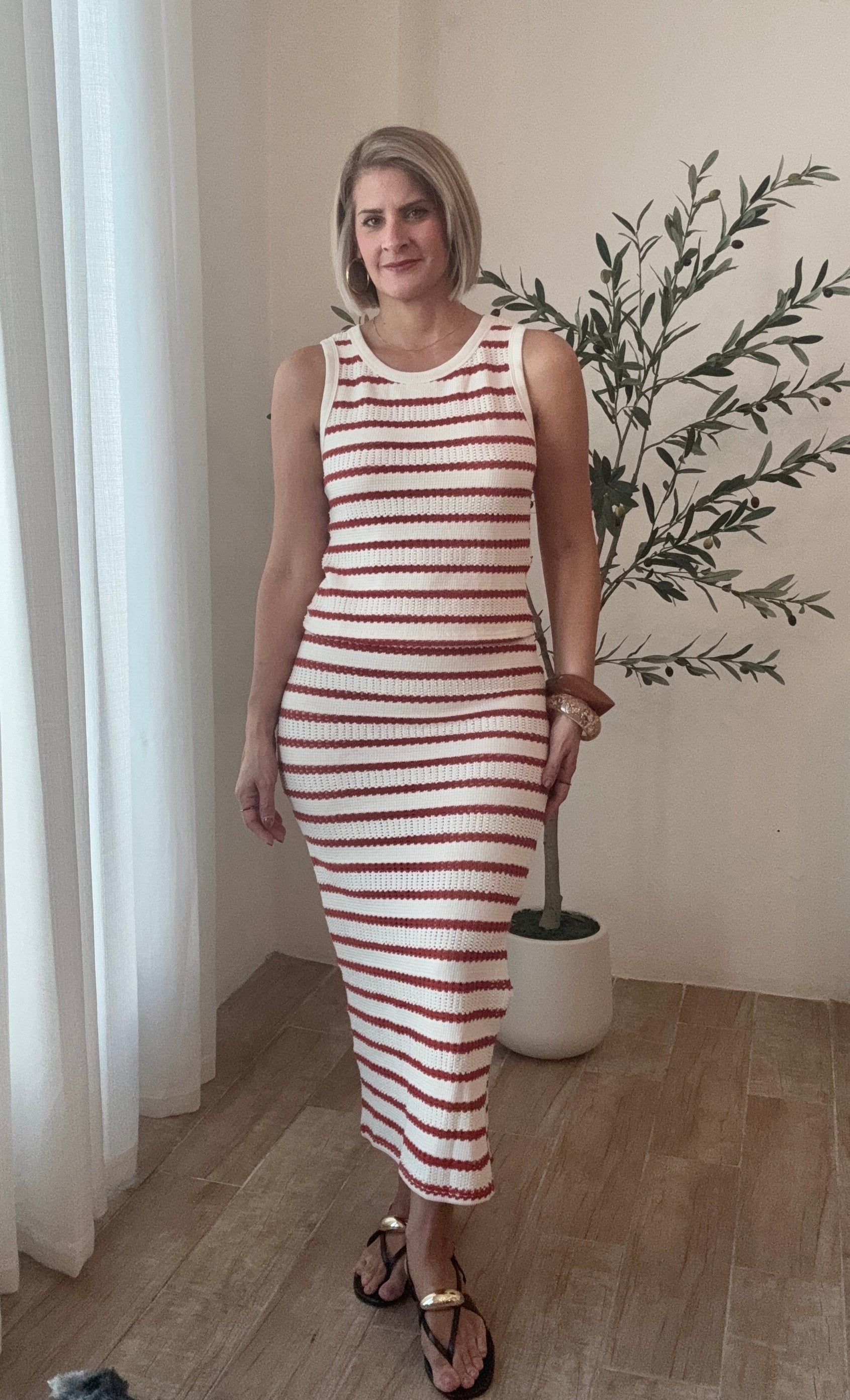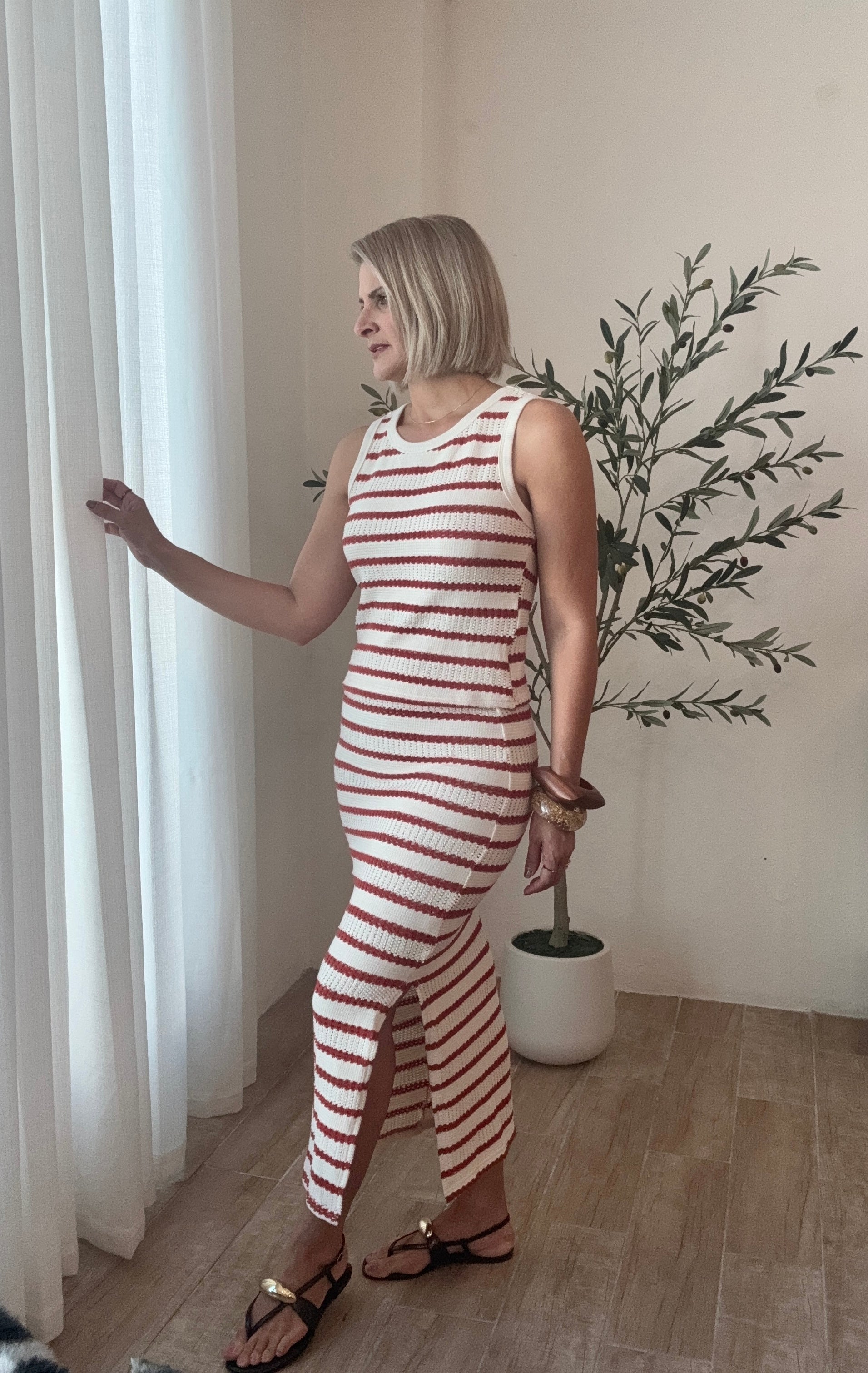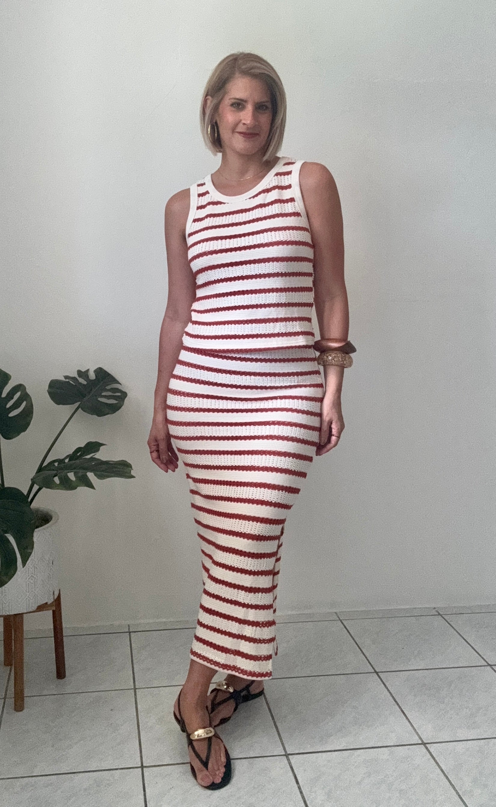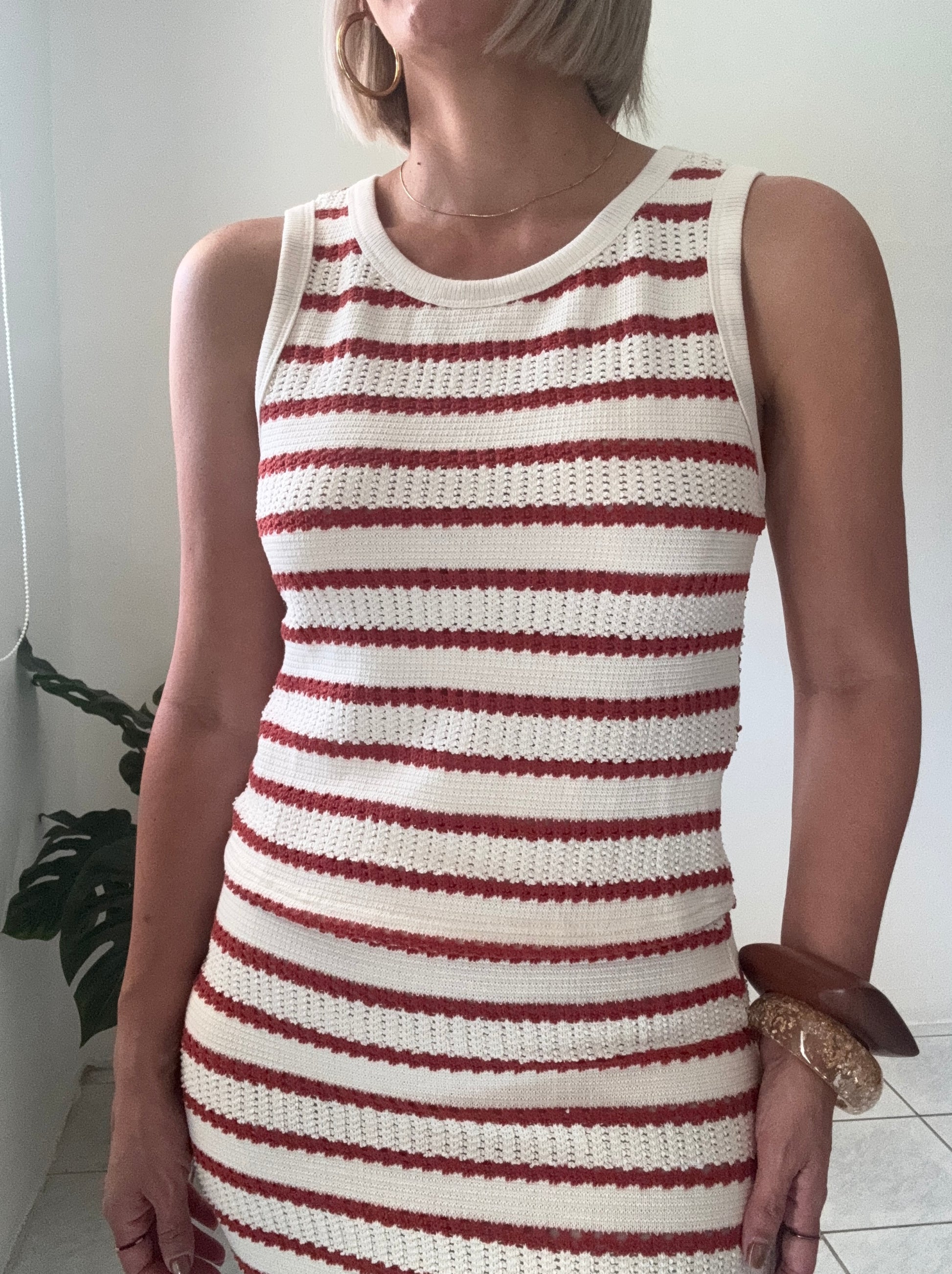 Juvenil set en tela crochet-knit, algodón y spandex en contraste de colores rojo y blanco. Top estilo "tank" de cuello redondo y falda en combinación de cintura elastica, tiene slit (abertura) al lado y largo maxi. Este set asegura un entalle perfecto porque corre muy comodo. Marca de excelente calidad y corre a su talla regular.