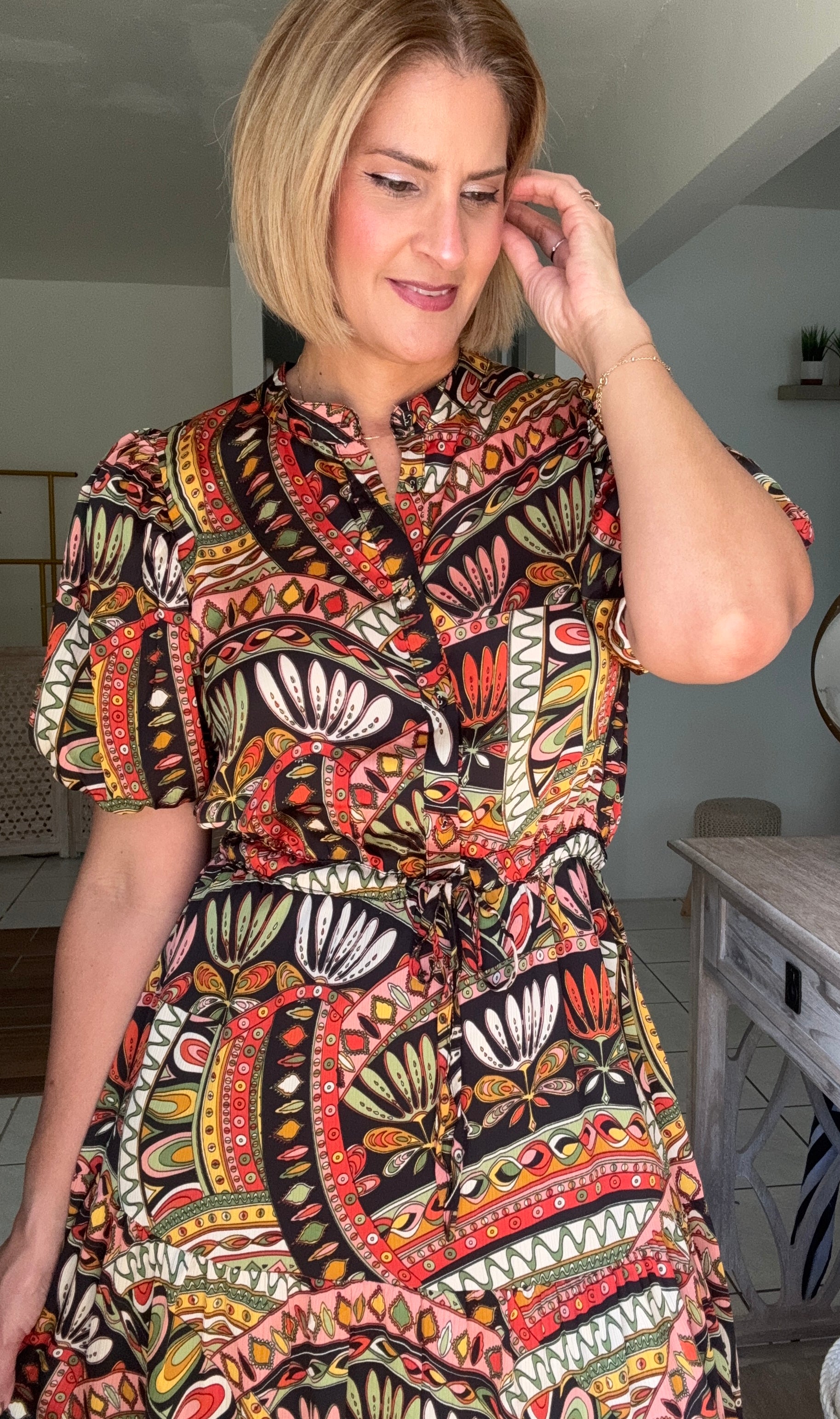 Vestido midi en tonos otoñal en fresca tela poliéster con mangas estilo globo con elástico, botones frontales funcionales, cintura elastica, amarre de ajuste en la cintura y la falda esta forrada. Combina no solo un estilo modesto liviano sino muy comodo.