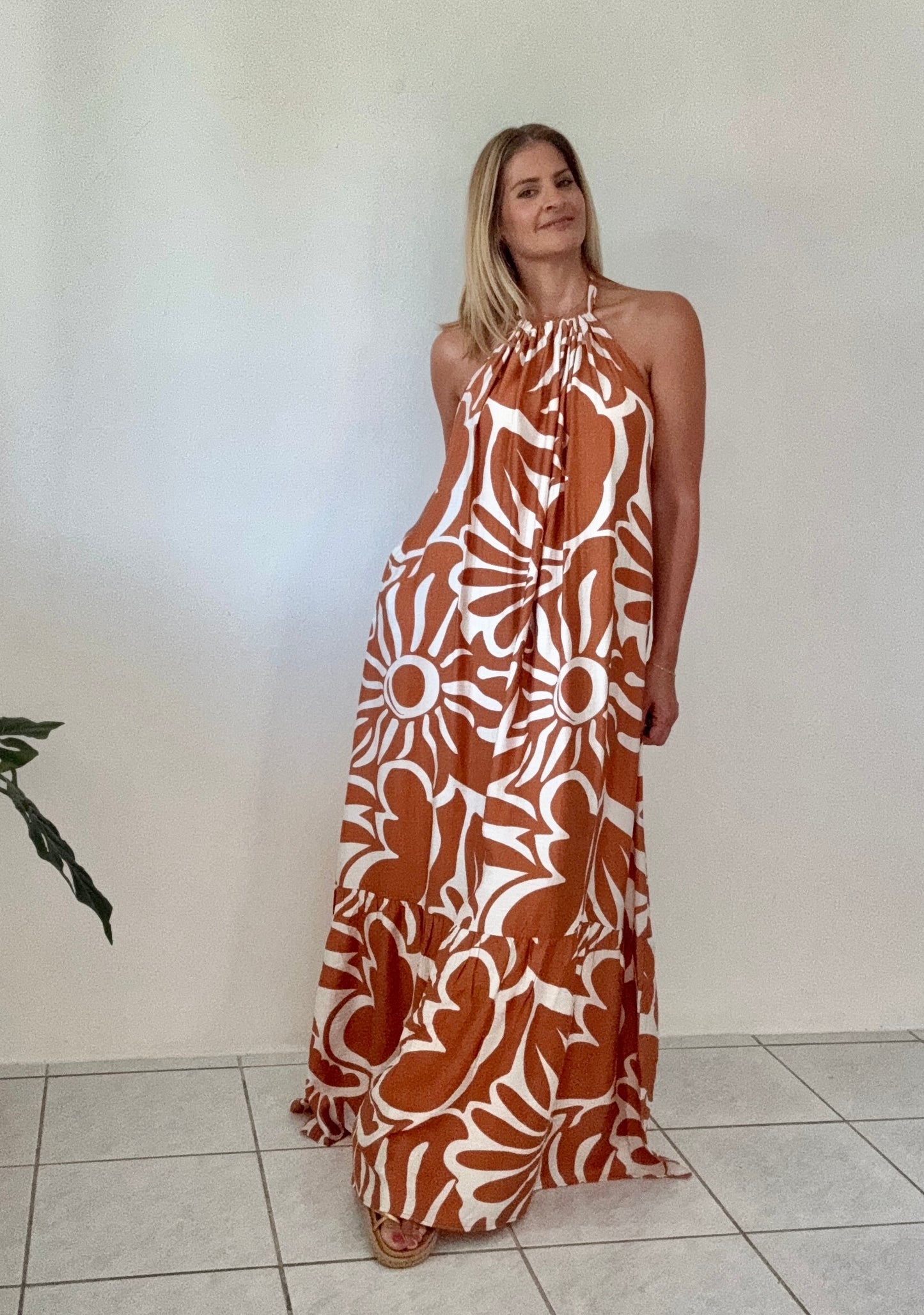 Bello vestido veraniego maxi en liviana tela rayon color terracota con estampado blanco, de entalle "relaxed fit" por lo que queda muy comodo y sueltecito. De cuello estilo halter que amarras en la parte posterior del cuello y llevas la espalda al descubierto para un look mas atrevido. Parte baja de la espalda tiene elástico y bolsillos laterales funcionales.